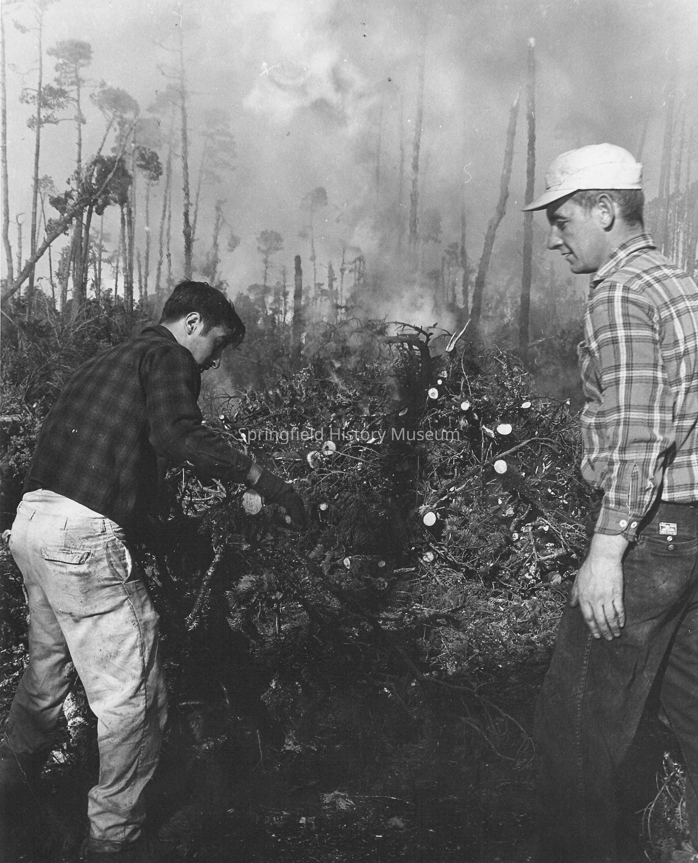 Photograph of two unidentified men at slash burn site. Appear to be piling small branches or trees for burning. Undated