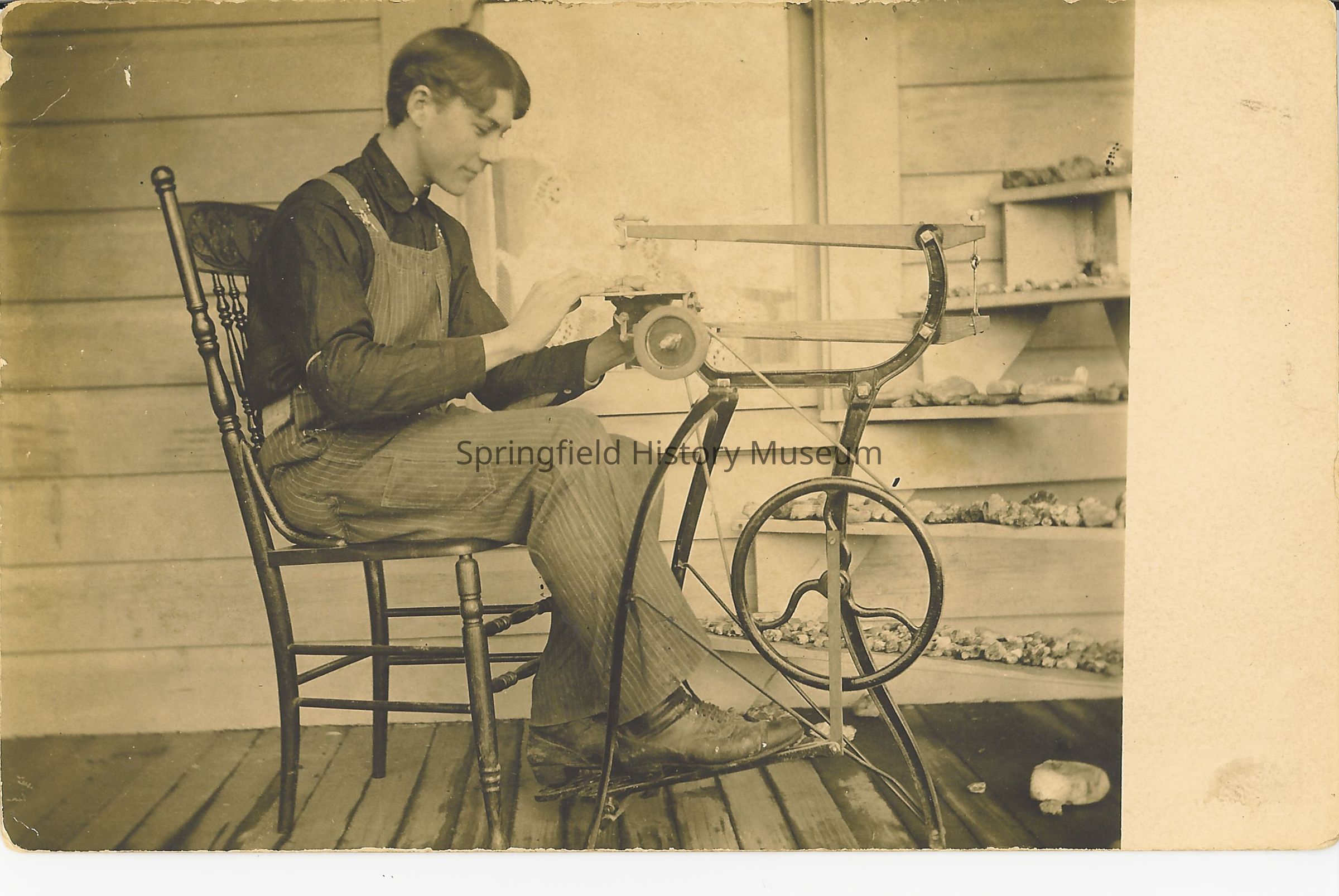 Postcard of a young Smith Mountjoy at a jig-saw with foot treadle, no date.