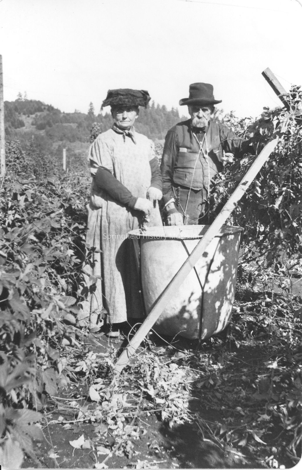 Photograph of Smith Mountjoy's mother and father, Jane and Zachary Mountjoy, standing in the hop fields. Unknown location and date.Collection