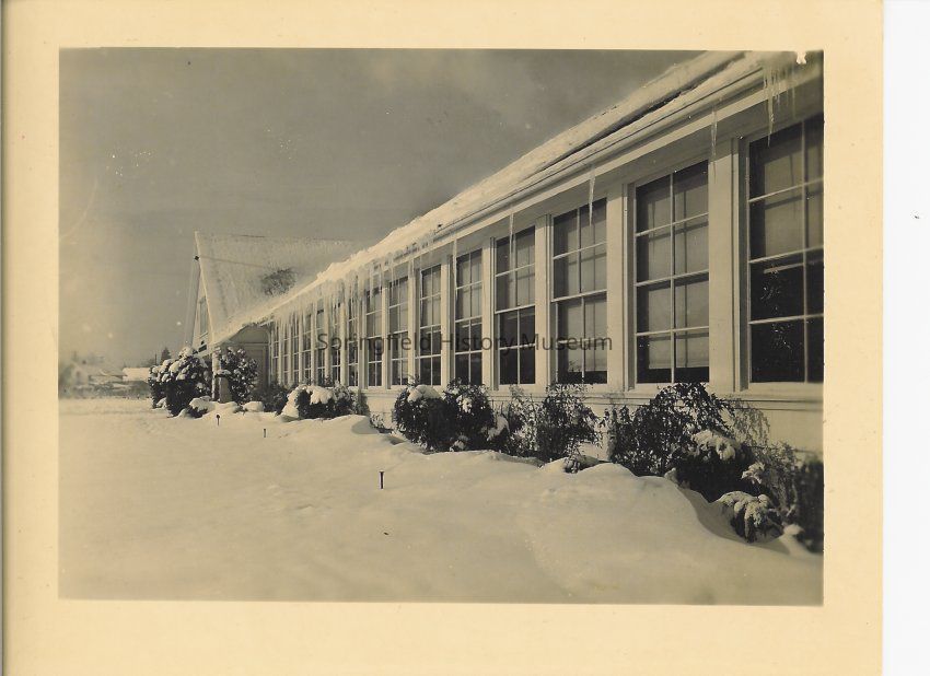 Photograph of Springfield High School, snow along side of building. Winter of 1949 - 1950.Photograph Details