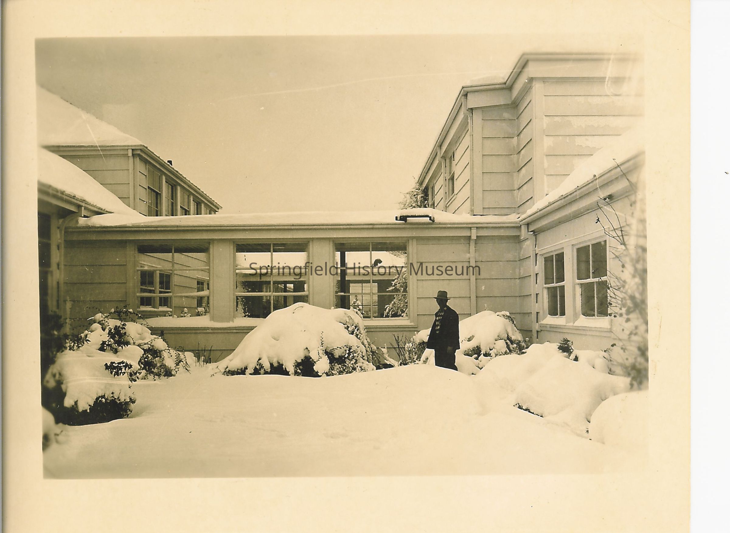 Photograph of snow at Springfield Union High School, unidentified man in photograph, 1949-1950Photograph Details