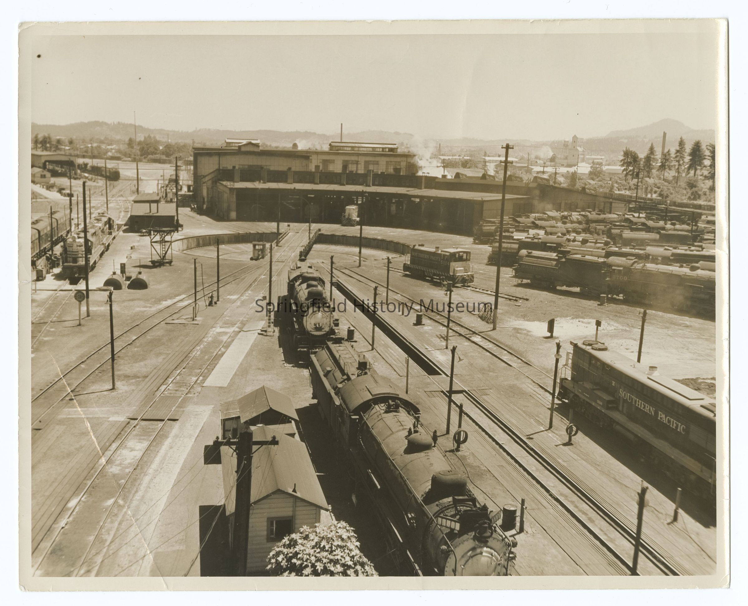 Photograph of Southern Pacific Railway roundhouse and depot, Eugene, 1954Photograph Details