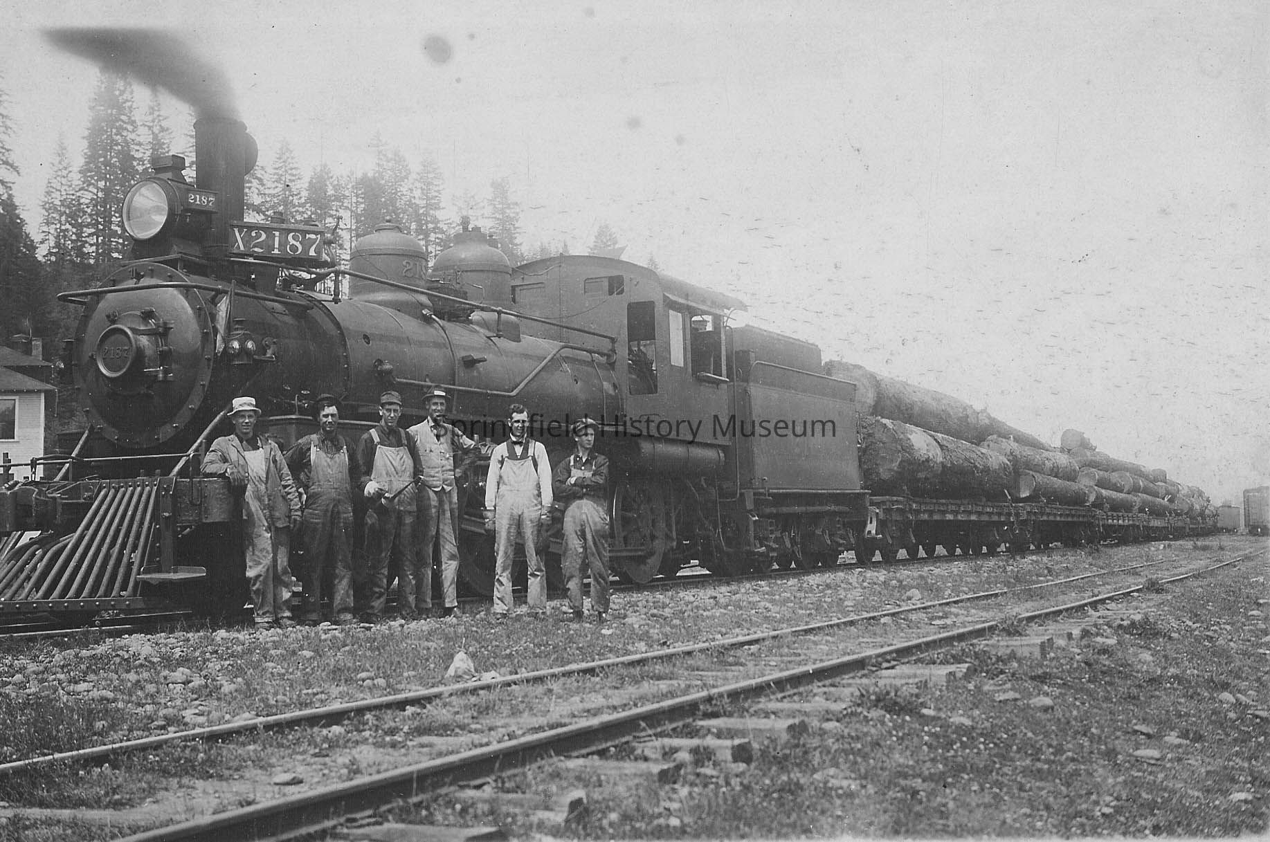 Photograph of Southern Pacific train, X2187, hauling logs on the SP Wendling branch. Six men next to the train.