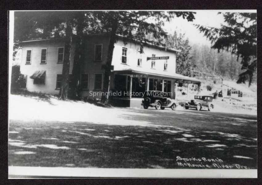 Photograph of Sparks Ranch with two cars in front of it at McKenzie River, Oregon, undated