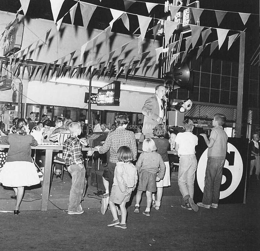 Photograph of Shoppers Paradise August 1957. Speaker at podium in front of Hull's Cafe.Photograph Details