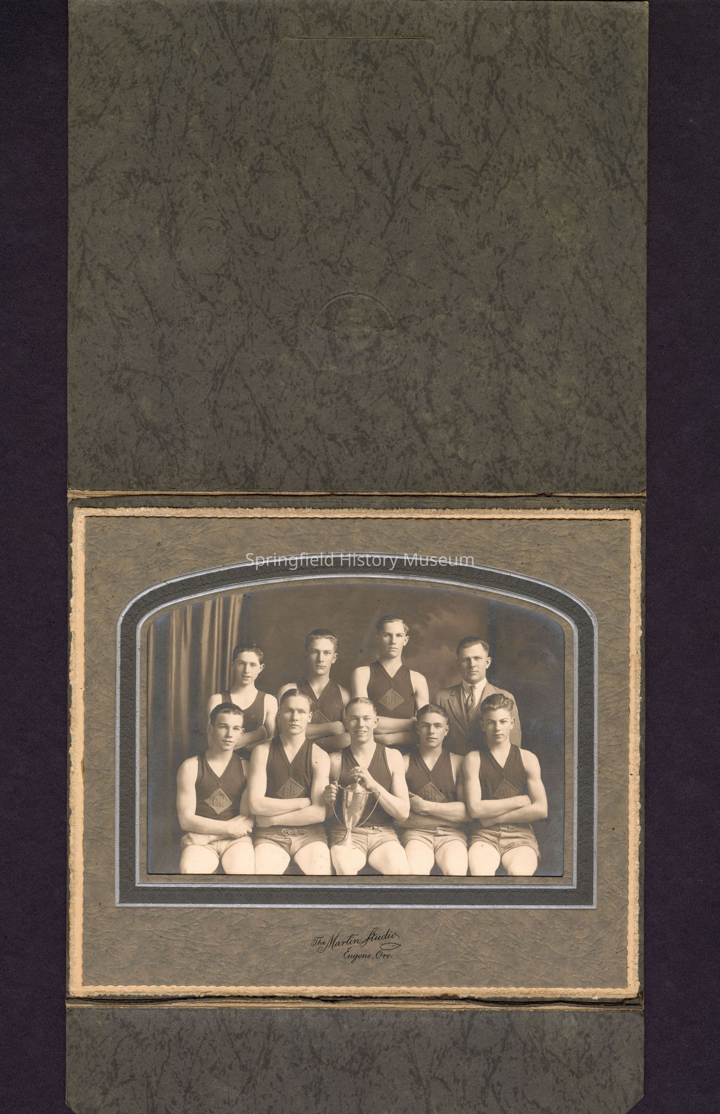 Sepia photograph in a folding paper frame of a sports team posing for a portrait with a trophy. There is one man in a suit and 8 young men in uniforms consisting of shorts, belts, and sleeveless v-neck tops with "P.H" in a diamond on the chest. The silver trophy says "Champions of B[illegible] Lane County given by [illegible]." [Possibly Pleasant Hill basketball team?]Lexicon