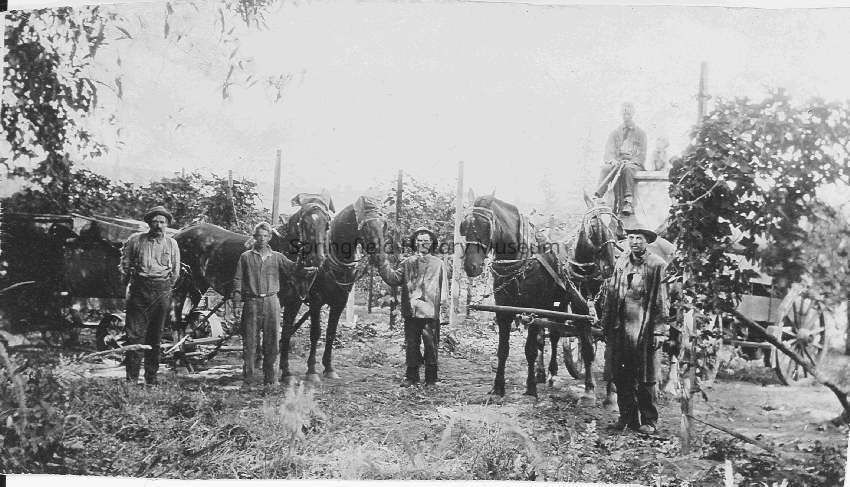 Men with wagons and horses in the hop yards near Dorris Ranch on South 2nd Street in Springfield. Spraying time at the hop yards. Donor thinks photo was taken around 1916-17.