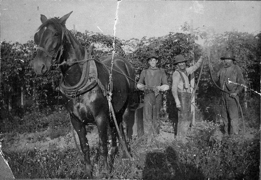 Three men said to be Arthur Easton (left), Jesse Easton (middle) and Edwin Schwering (right). Horse in foreground, men appear to be spraying water(?) on the hop field. Donor says Jesse Easton came from England to work for William Smeed. Later he sent for his wife and child. Eventually he bought his own farm on McKenzie, just north of Hendricks Bridge, and raised hops.