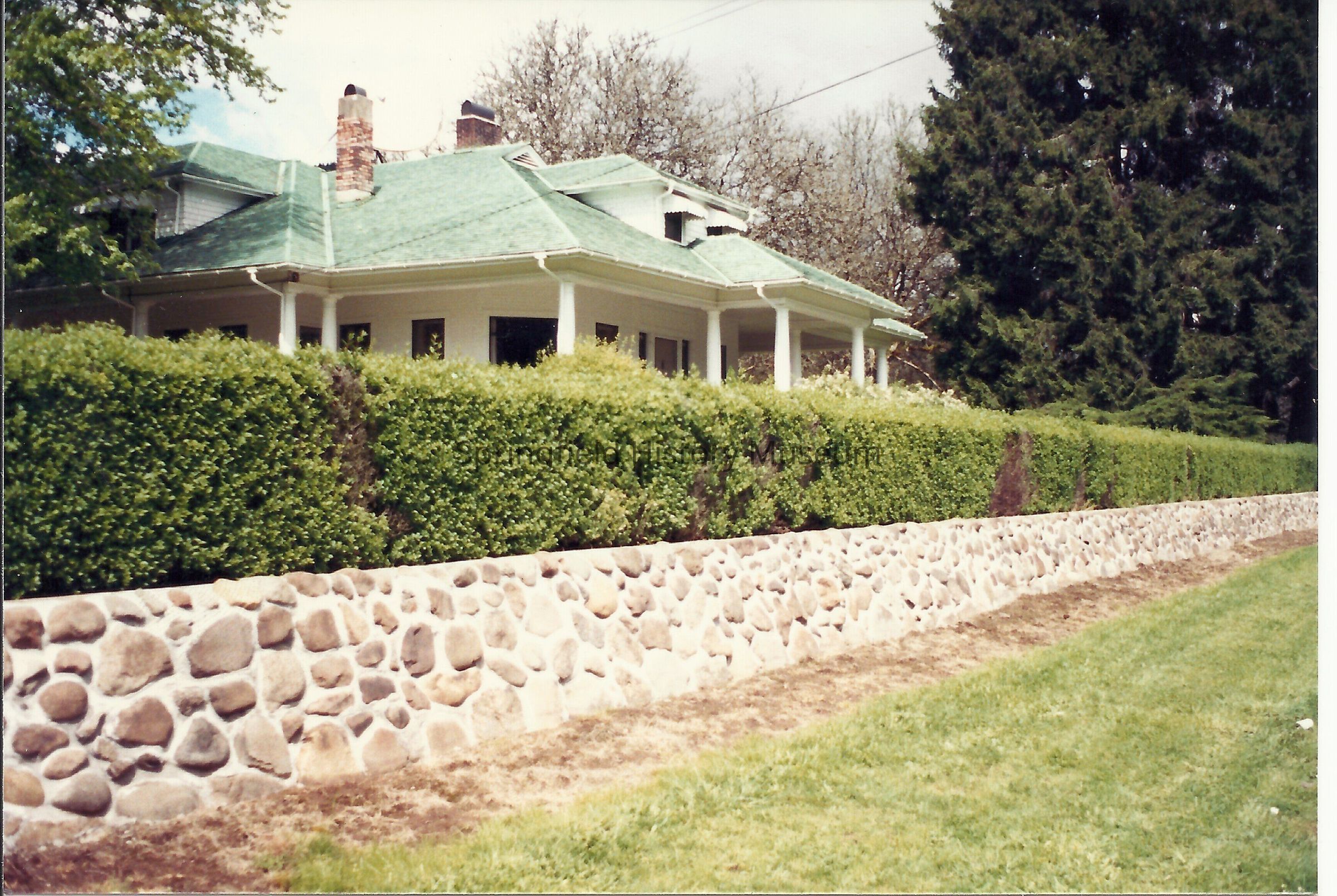 Photograph of white house with green roof, view obscured by bushed description of back: "Spring Creek Holly Farm McKenzie River"