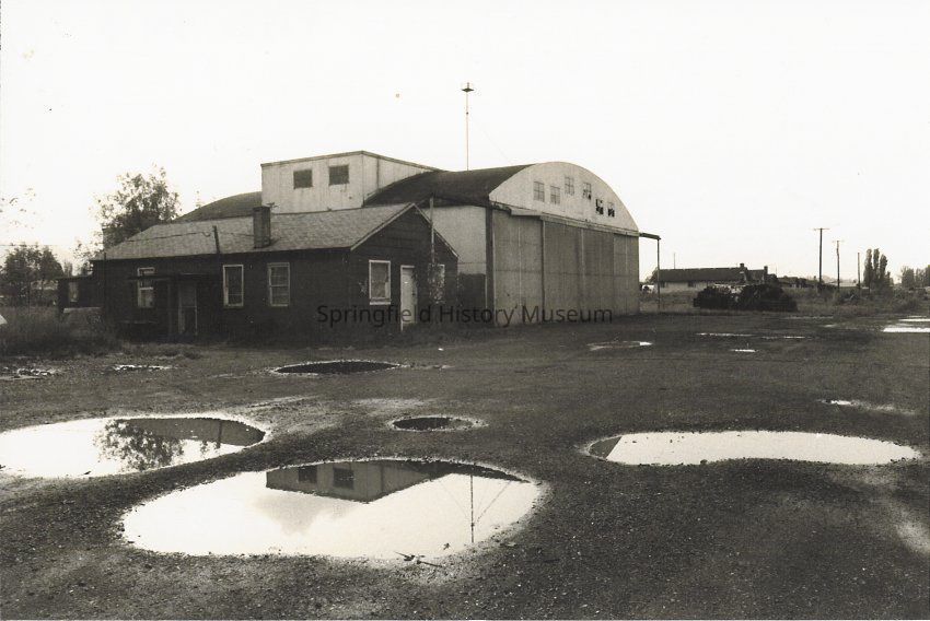 Hangars, with big pothole puddles in foreground. The Springfield Airport. Undated