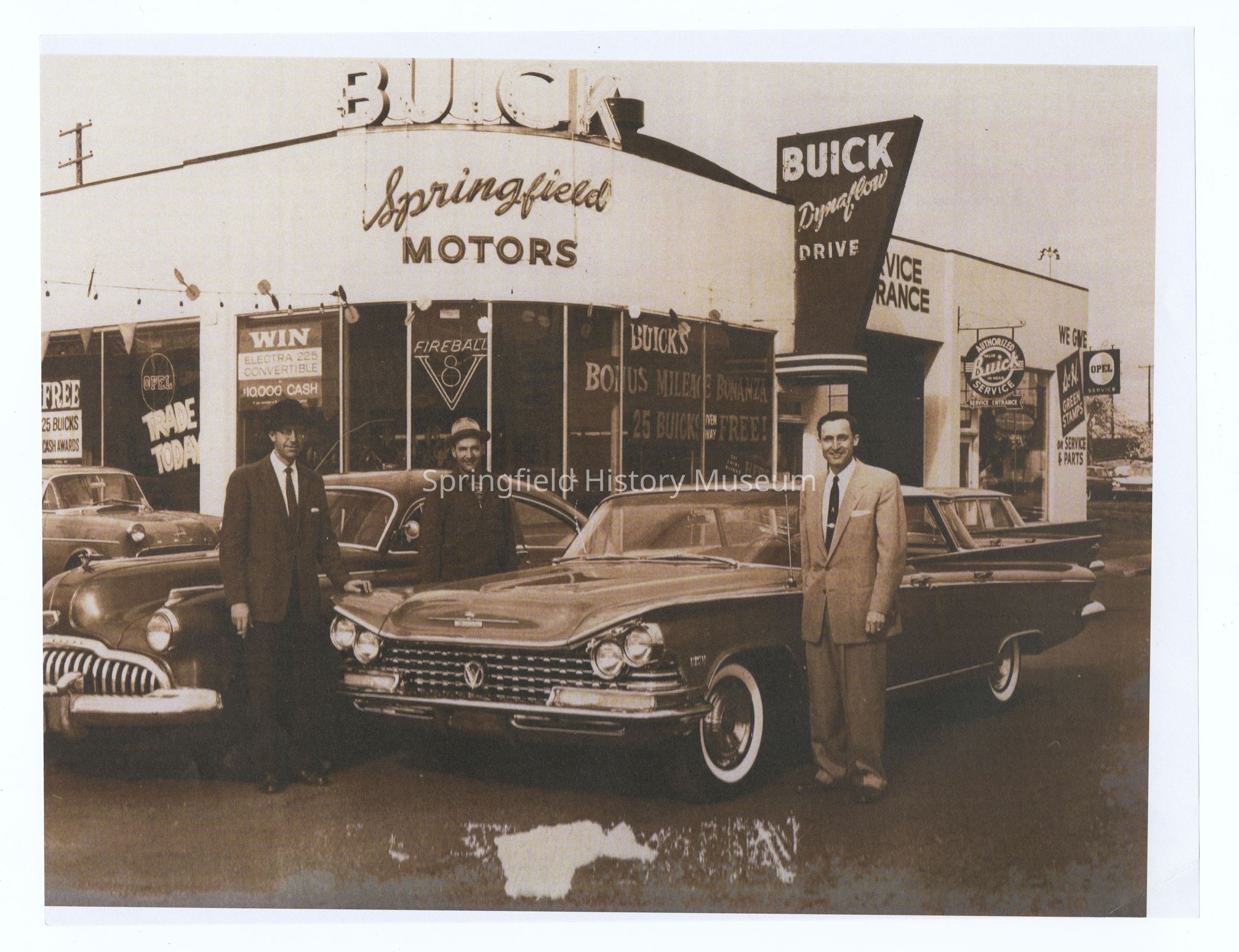 Photograph of Springfield Buick, undated, circa 1950. Clarence Scherer?, Don Briody, and others. Photocopy.Photograph Details