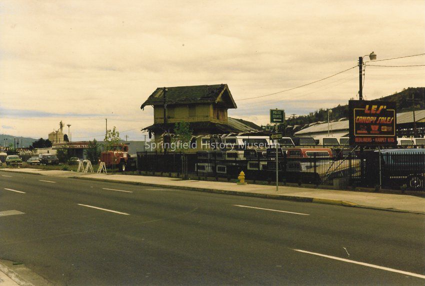 Springfield Train Depot building by Les' Canopy Sales. Street in foreground. Undated.