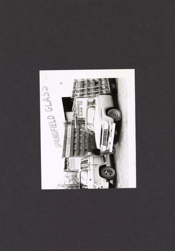 B&W Photo of Springfield Glass Co. with two trucks, man standing between them.Collection