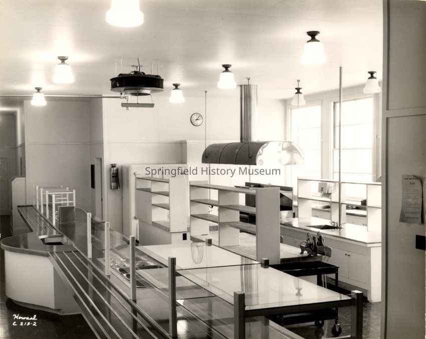 Springfield High cafeteria in August 1948. Room is new with no dishes on the shelf. Marked Howard C213-2.Photograph Details