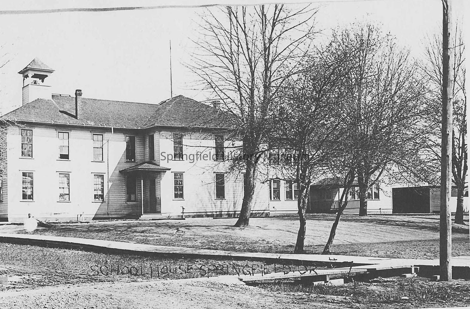 Photograph of Springfield High School and grade school, 1908. Located at Mill Street. Two story building with wooden sidewalks, bell tower, and trees with no leaves.