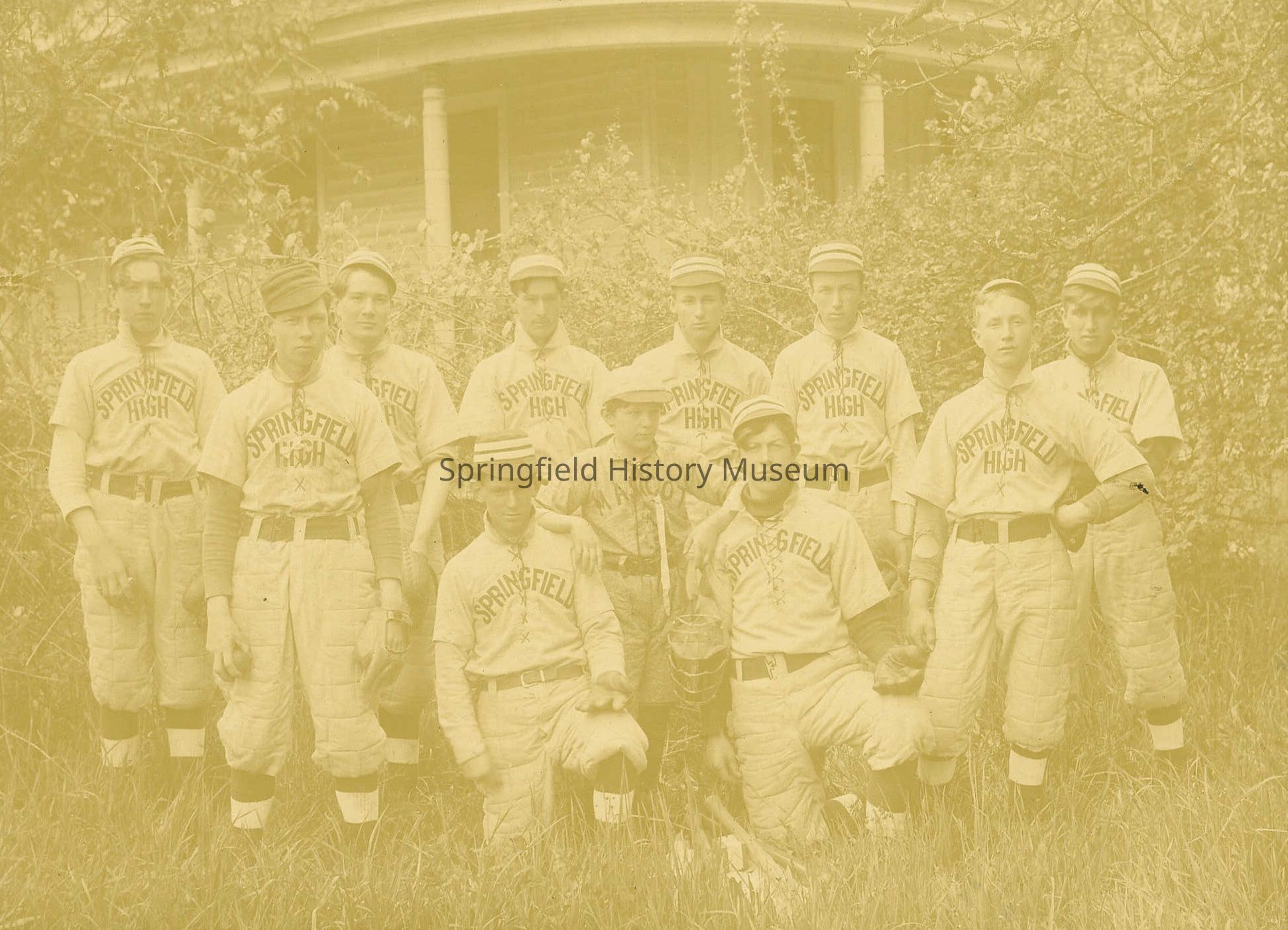 Photograph of Springfield High School Baseball Team photographed around 1905. Eleven uniformed members (ten plus bat boy) standing in front of a historic house with a curving wooden porch.Photograph Details
