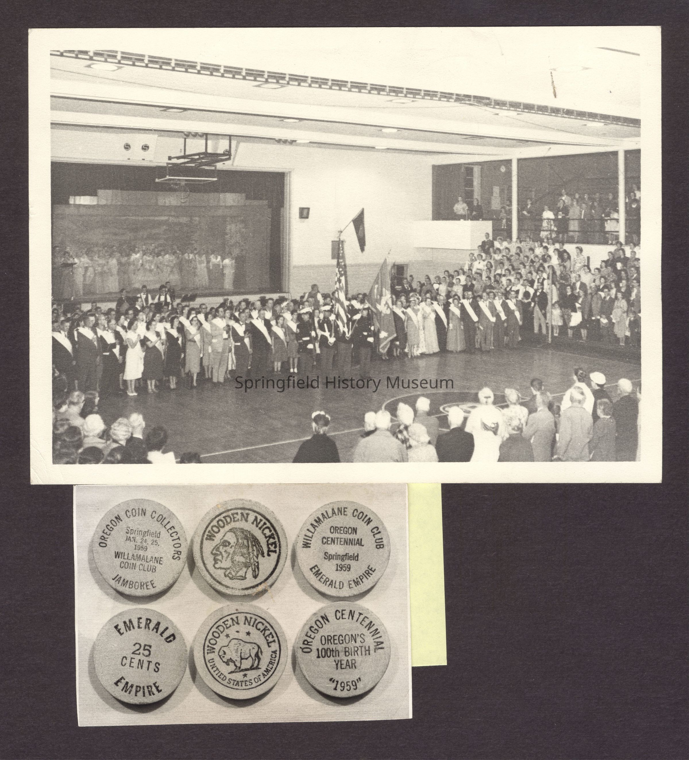 3B&W Photos of Springfield High School celebrates the Oregon Centennial, 1959. The men and women in the audience with banners are historians of various civic organizations in Springfield. They each placed their histories in the time capsule which was buried in Willamalane Park. The capsule is to be opened in the year 2059.Collection