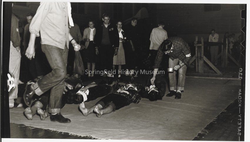 Photograph of Springfield high students participating in floor feeding initiation games, class of 1953Photograph Details