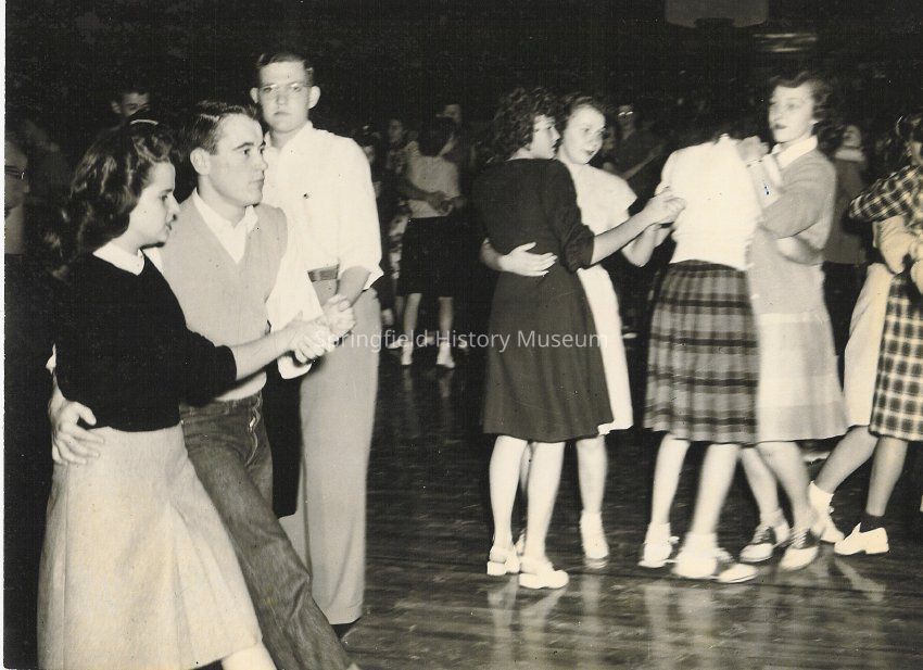 Photograph of Springfield High School dance, 1944-47, several students at a dance in the gym, one identified person Joyce Bryson on left side of photo.Photograph Details