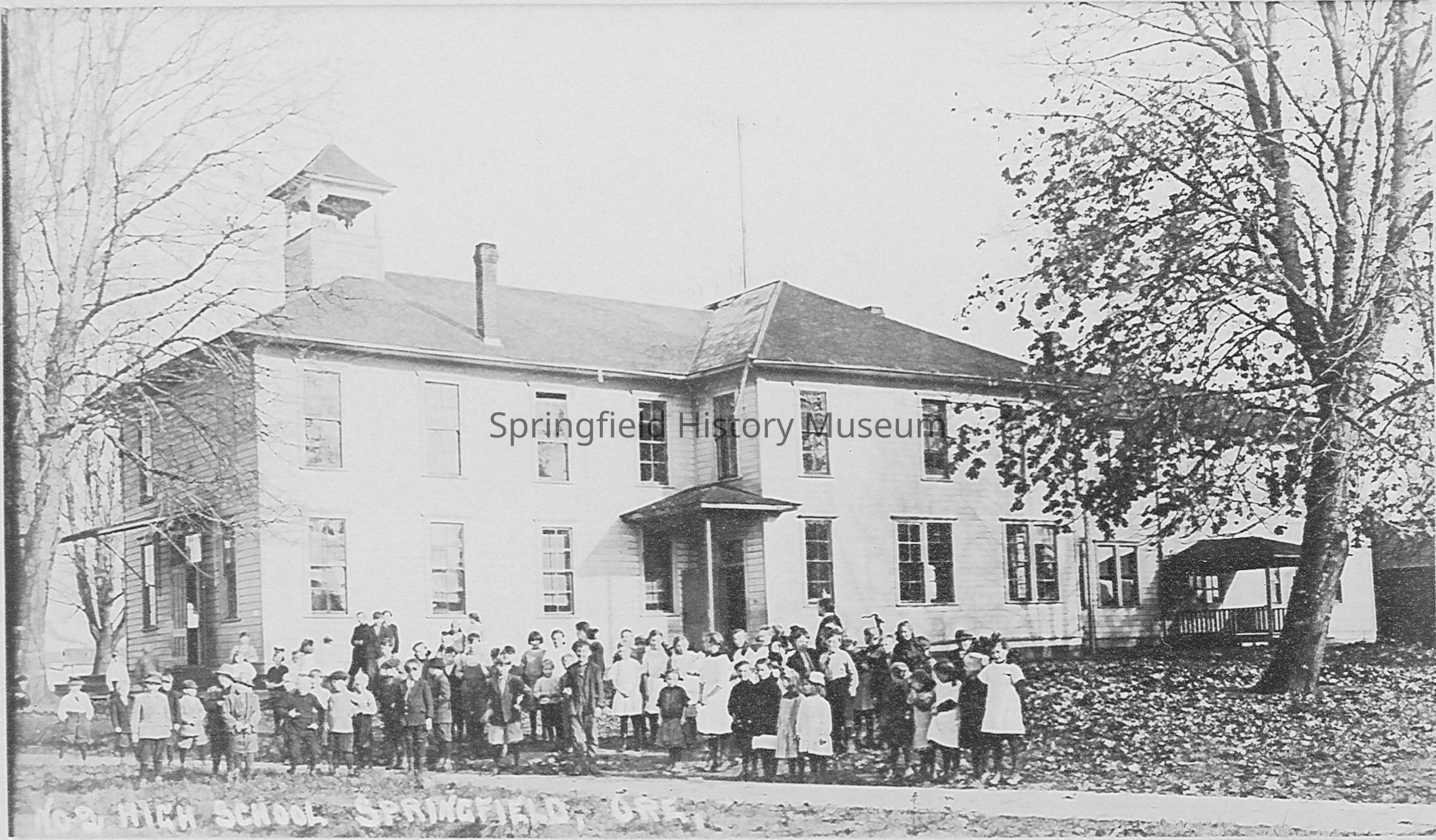 Springfield High School on Mill Street. Many students standing in front of the building, no date.