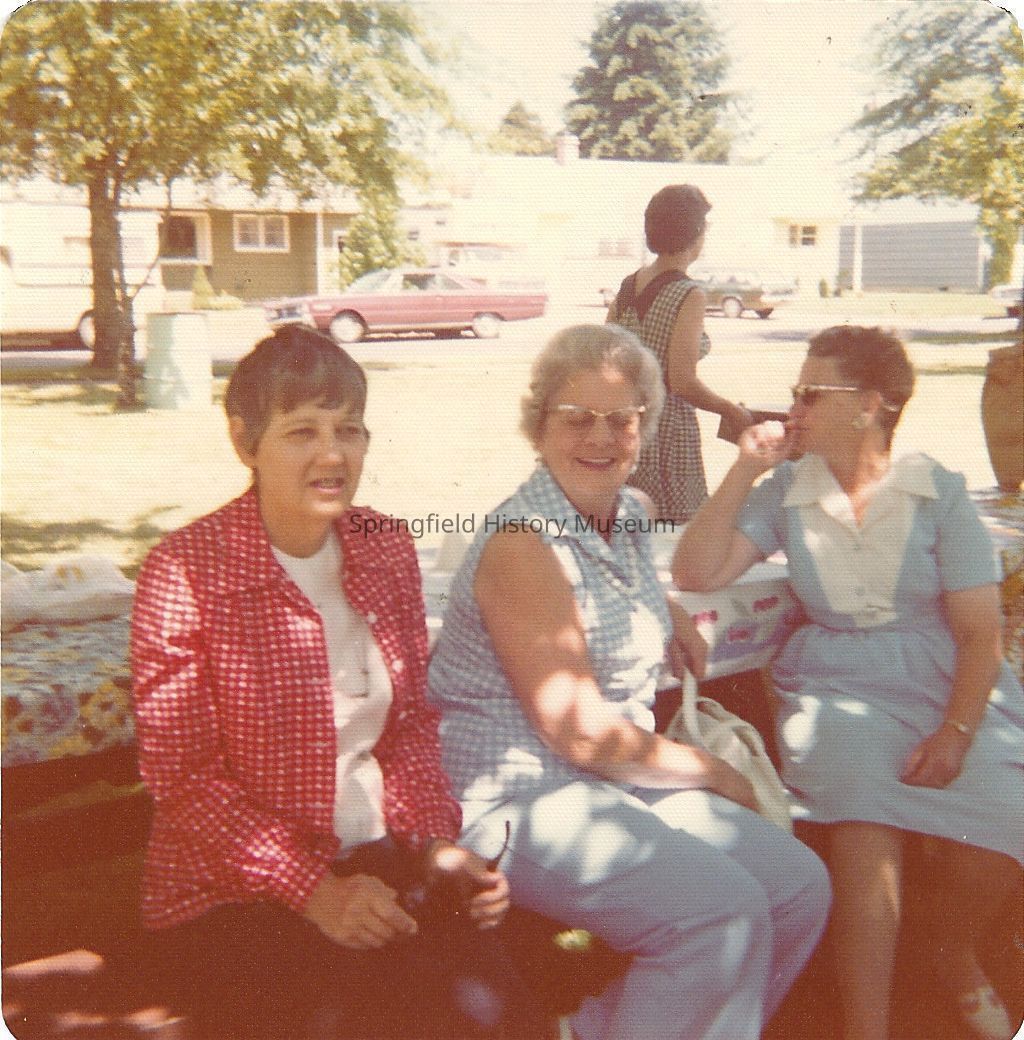 Springfield High school reunion held about 1970 for the class of 1930. Reunion was held in Willamalane Park. Three women seated at picnic table in shade.