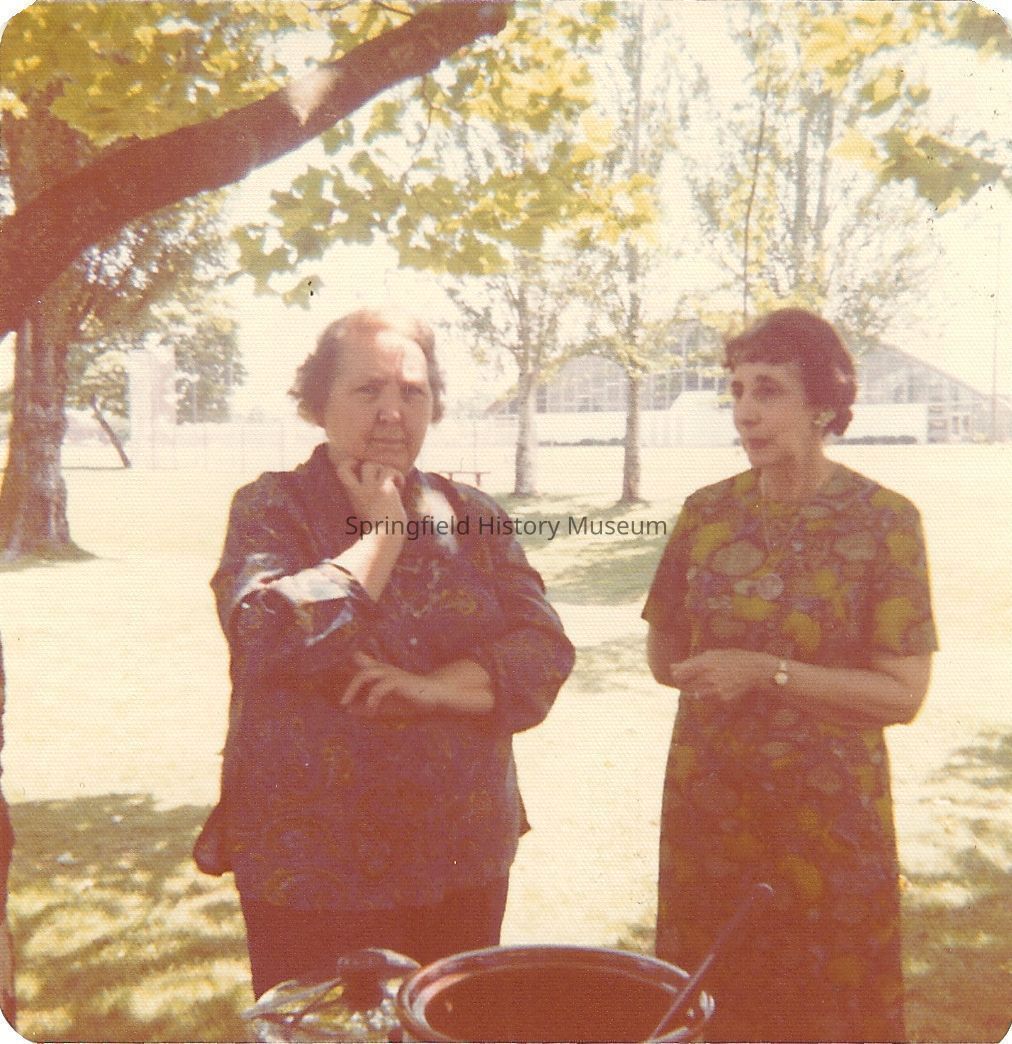 Springfield High school reunion held in 1970 for the class of 1930. Reunion was held in Willamalane Park. Two women standing in shade, on left, Audrey McFarland Patrick.