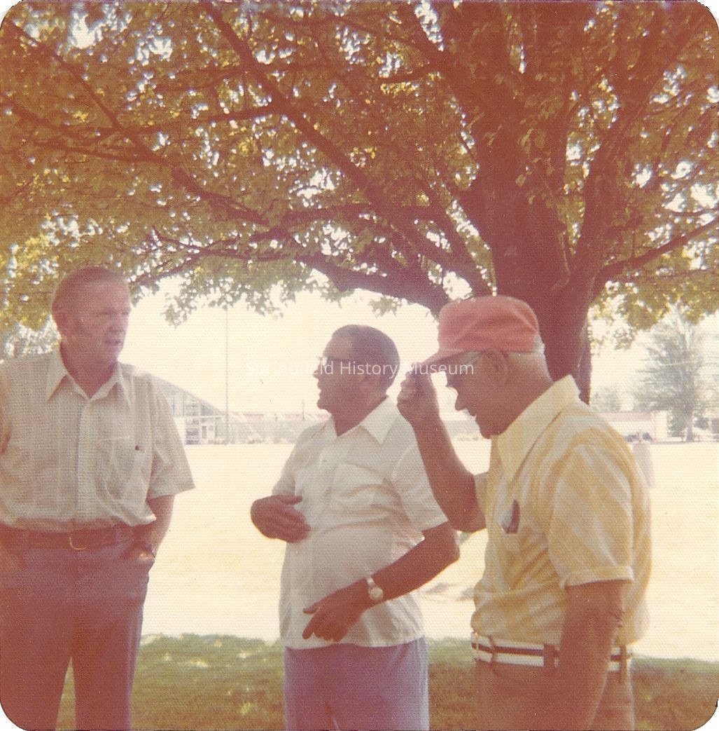 Springfield High school reunion held in 1970 for the class of 1930. Reunion was held in Willamalane Park. Three men standing in shade.