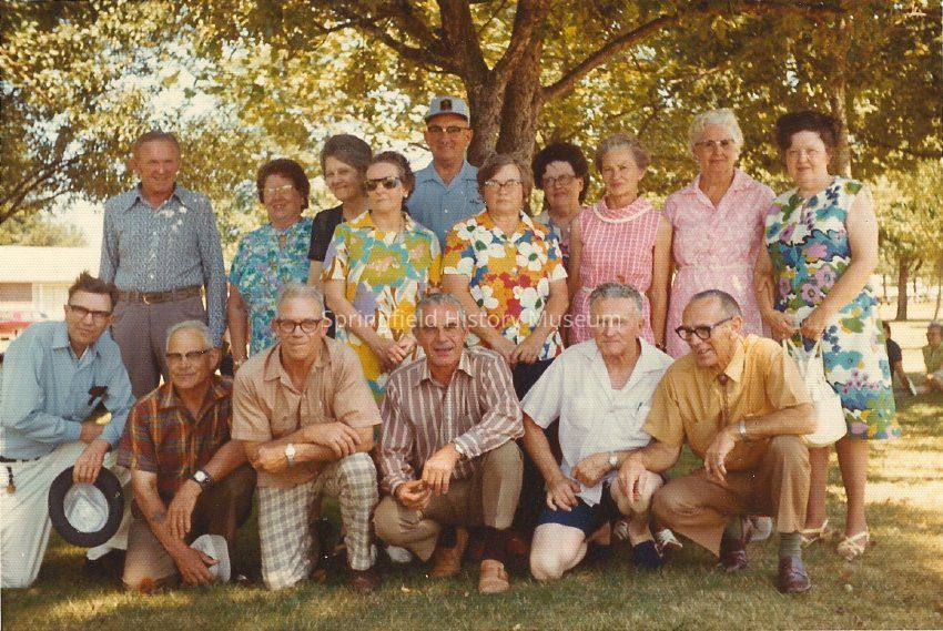 Group of people posed at reunion in Willamalane Park. Dated September 1973. Springfield High School.