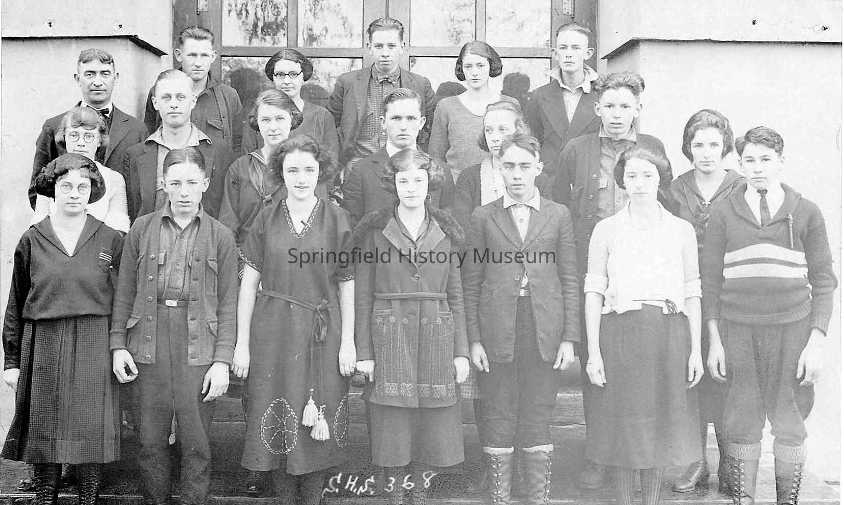 Photograph of Springfield High School class of 1923 seniors. Girl in center of front row is wearing a wide fur collar or capelet. Photo is on postcard marked on front SHS 368.