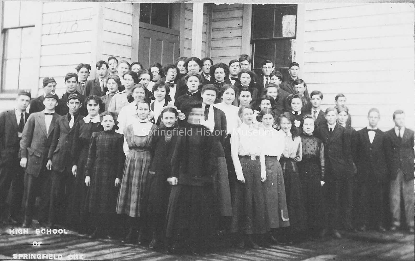 Photograph of High School of Springfield, Oregon student body of 1909-1910. Shows group of students standing on the steps of a porch. Five boys on the left of photo are wearing caps with a light colored emblem. Girl in front is blurry. About Forty-nine people in photo.Photograph Details