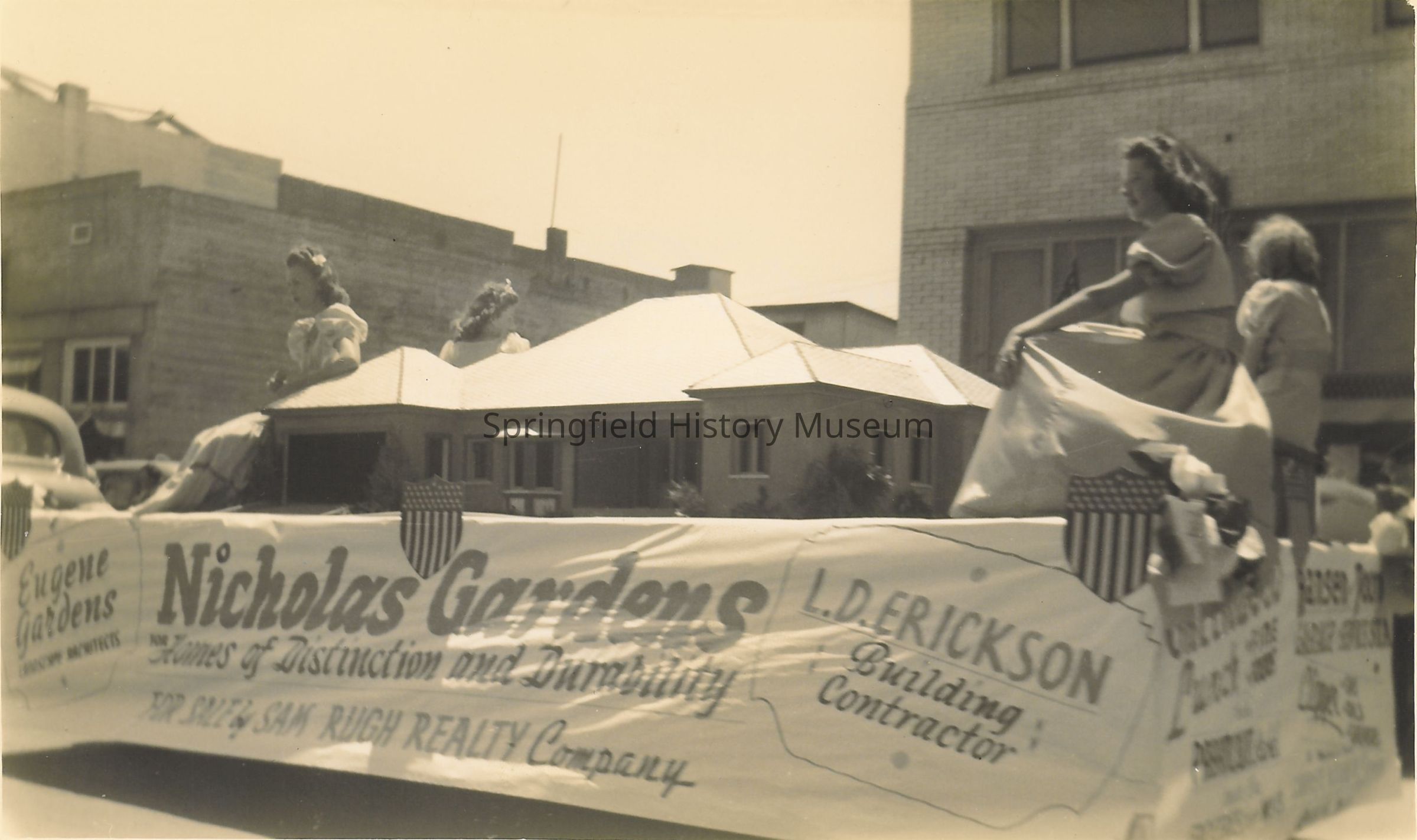 Nicholas Gardens Homes float with 4 women seated, one at each corner. No date.