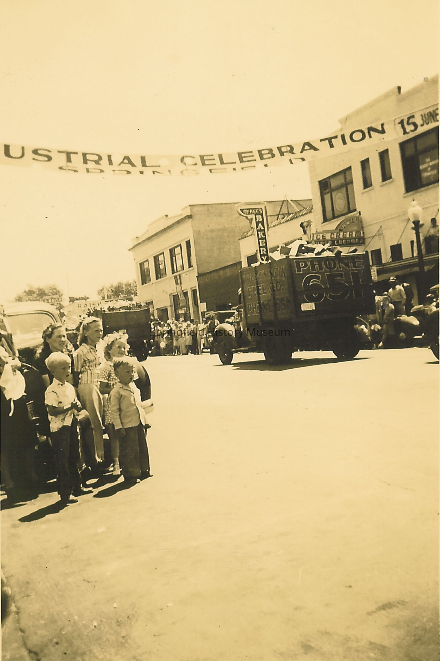 Truck with "Phone 651" on the back. Also partial view of banner reading "Industrial Celebration." 1941