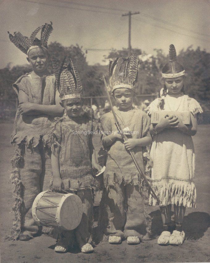 Indian maid holding first prize, roller skates. Springfield kids prepare for Oregon Trail pageant about 1948 [marked out 1946 lw]. Left to right: Chris Karp, Billy Karp, Charles (Spike) Buckel, Mary Jo (Trudy) Buckel.