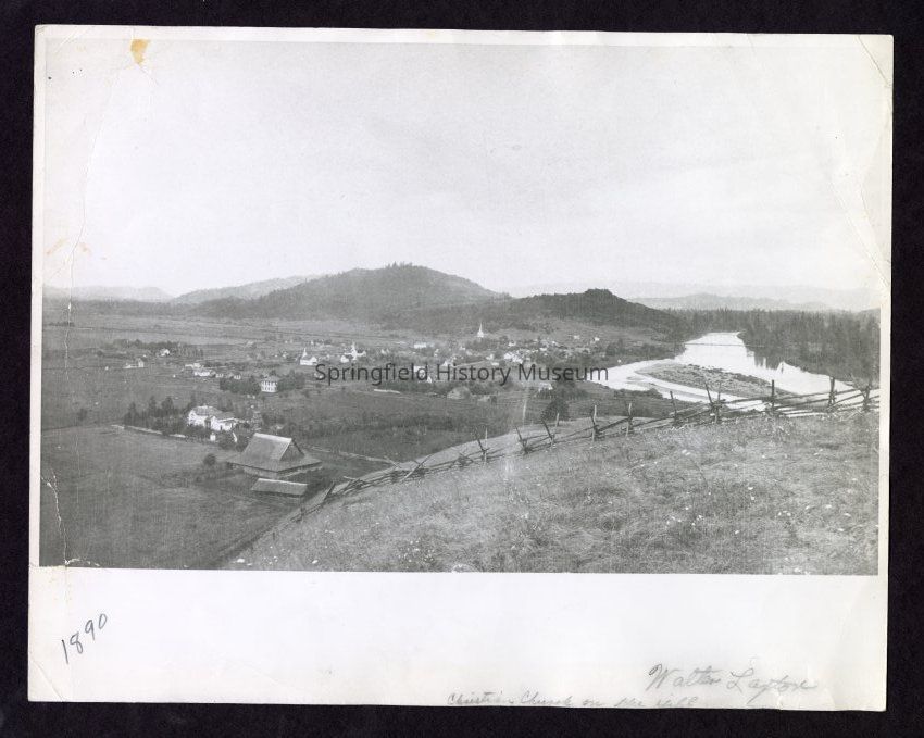 Overviews, Springfield Christian Church, Kelly Butte, Willamette River, Overviews, Scenic, Bridge, Fence, South Hills, Springfield--Overviews from Kelly Butte, Geographical Features---Kelly Butte, Geographical Features--Willamette River, Waterways--Willamette River, Buildings--Churches--Springfield Christian Church