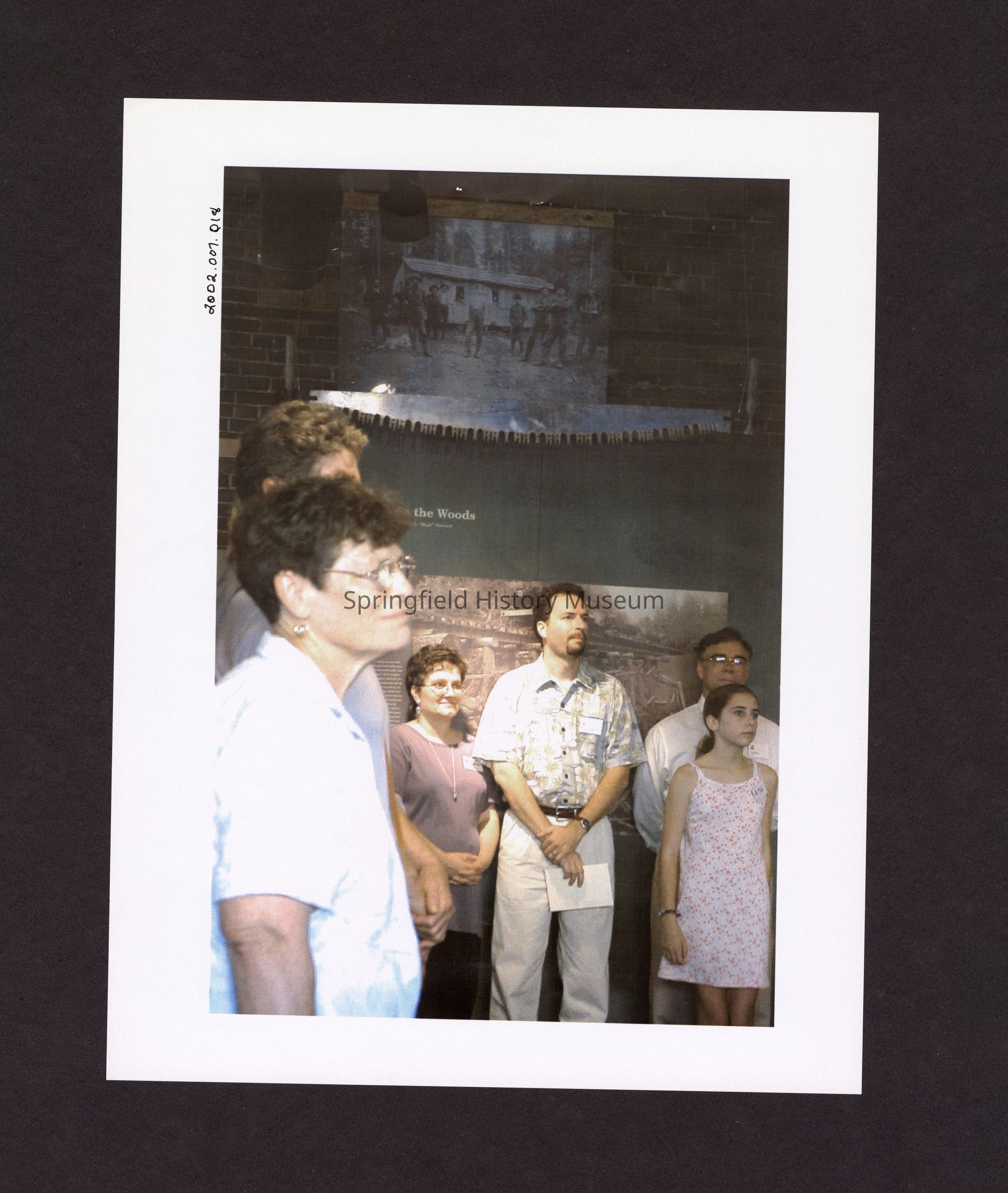 Color photograph of the Springfield Museum's "Working in the Woods" logging oral history exhibit opening in 2000.