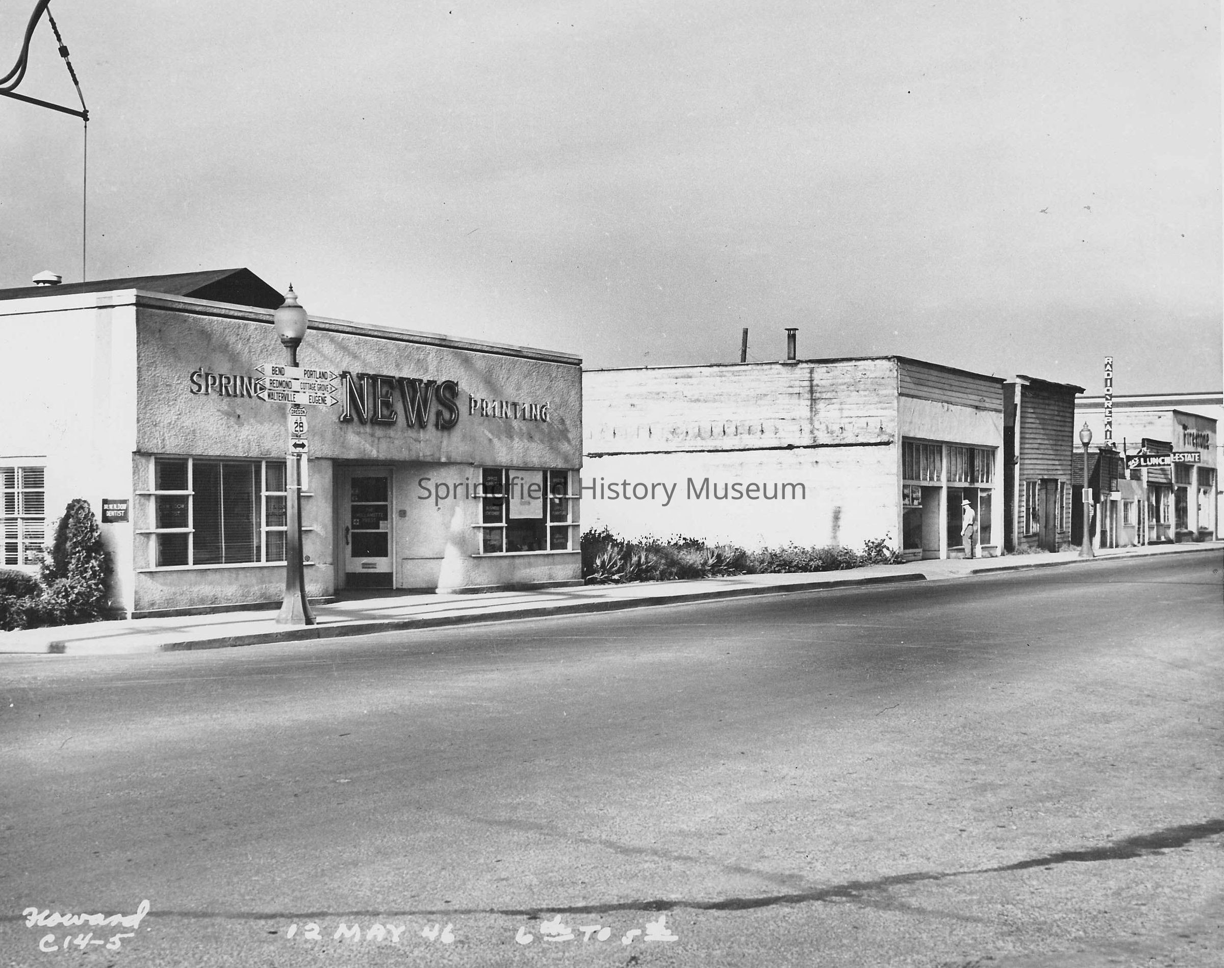 Business & Industry, Street Views, Springfield News Building, Main Street, 5th Street, 6th Street, Highway 28, Business & Industry--Springfield News, Buildings--Springfield News Building, Springfield--Streets--Main Street, Springfield--Streets--5th Street, Springfield--Streets--6th Street, Roads & Highways--Highway 28, Street Views--Springfield