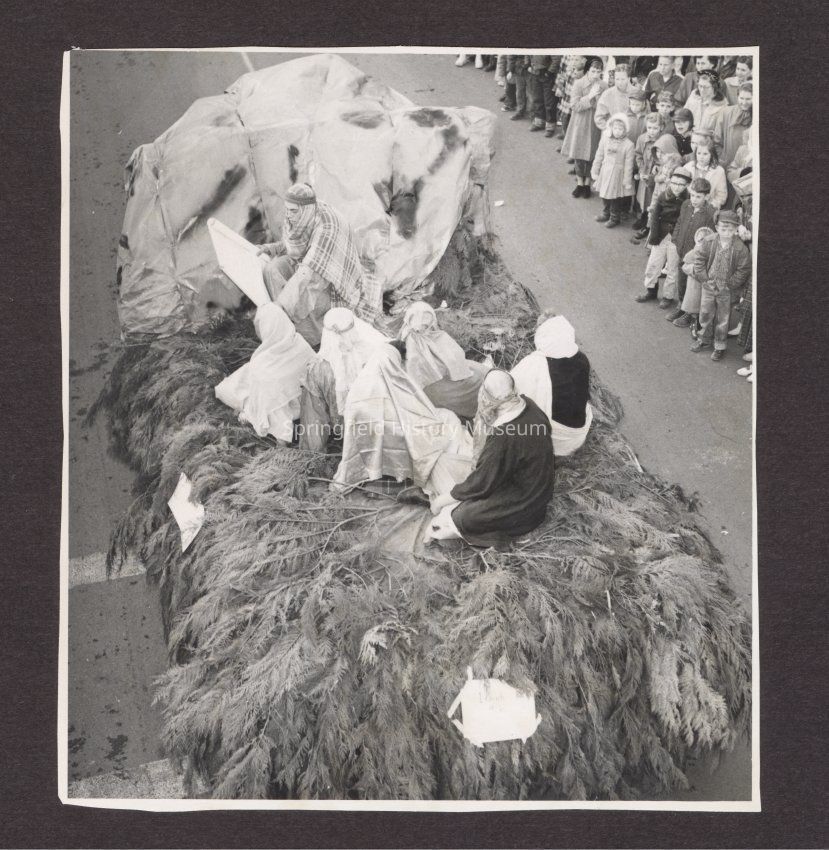 Photograph of Springfield Christmas Parade, circa 1950s. Float with Joseph and Mary on it.Collection