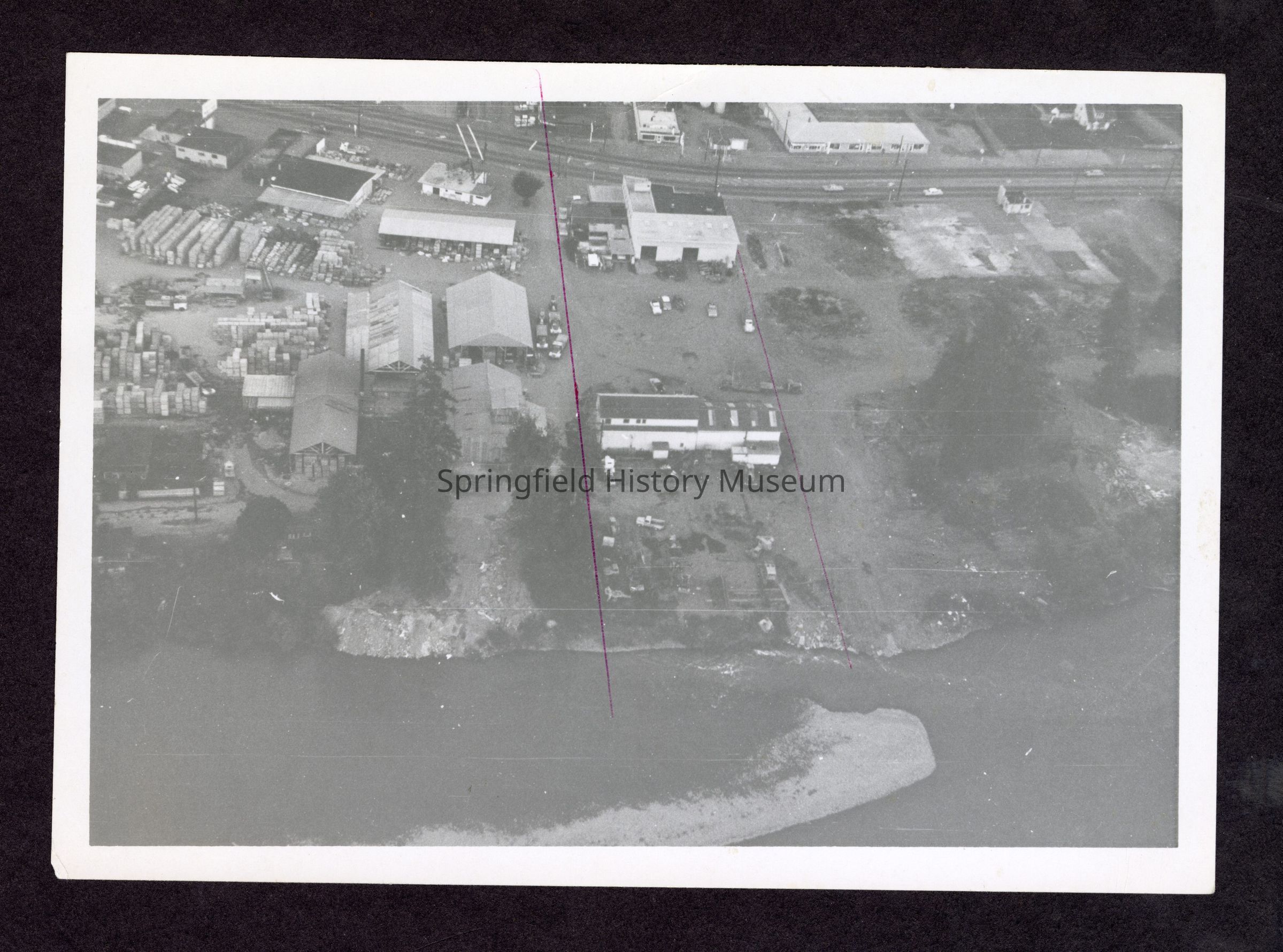 Black and white aerial photograph looking south, Intercity at top center, Willamette River in foreground. Two red lines over image.Collection