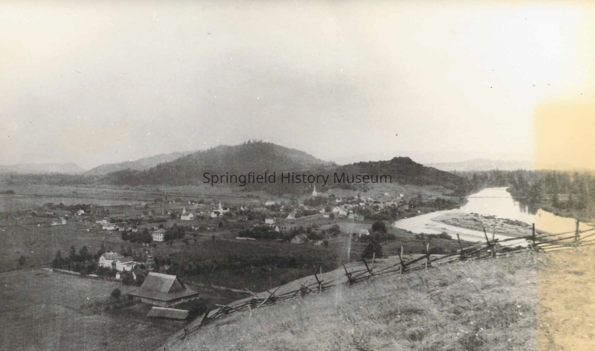 Photograph of Springfield overview looking south from Kelly Butte. In foreground is a wooden fence on hillside. Right side shows Willamette river, center shows town. UndatedPhotograph Details