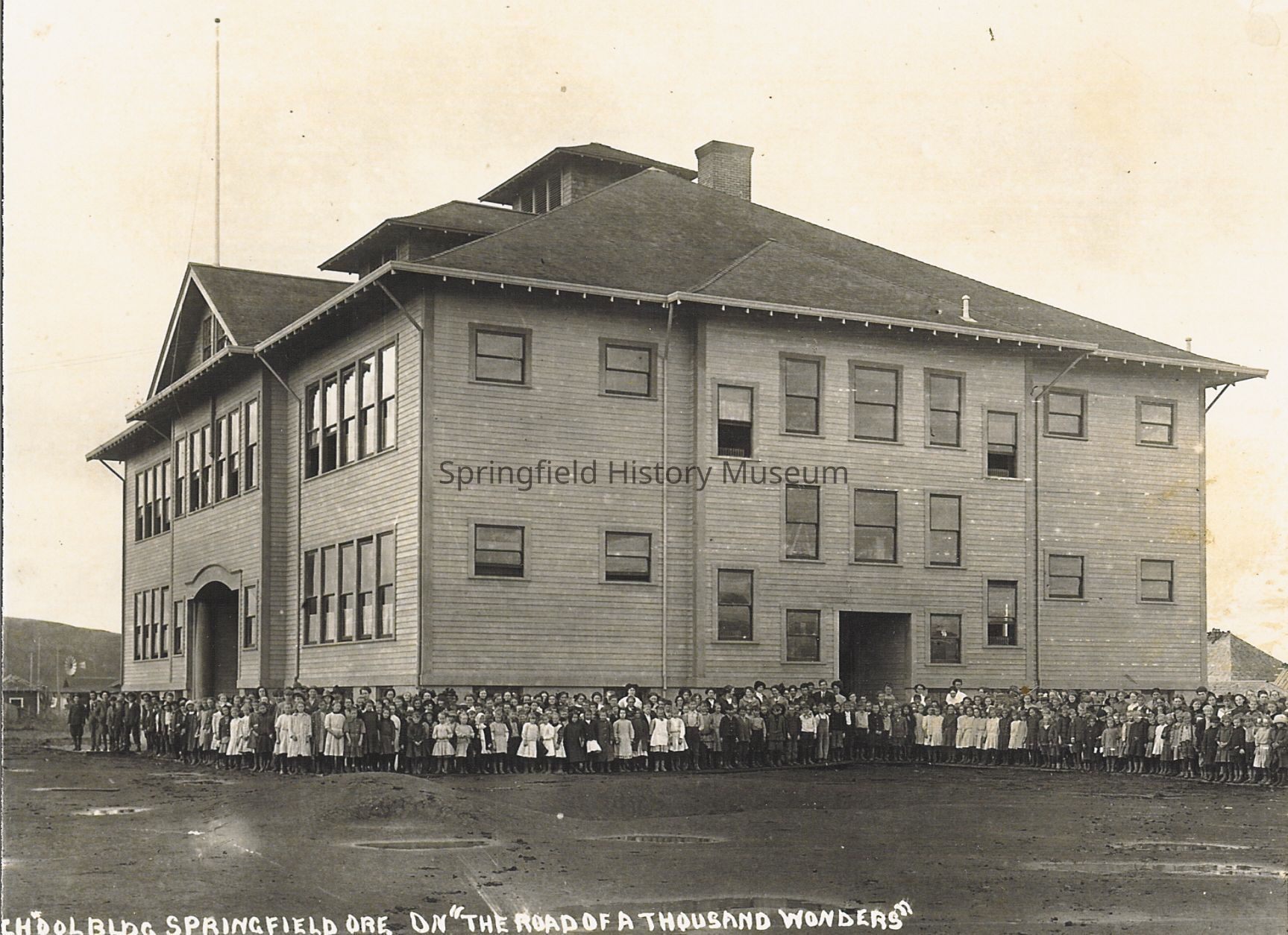 Glossy print from postal card, says "School Bldg. Springfield Ore. On 'The Road of a Thousand Wonders'" ca. 1908. *same as Lane Historical Museum's transparency file under LCHM-5; S3AIL78-5514 negative, original transparency from the Mountjoy collection.