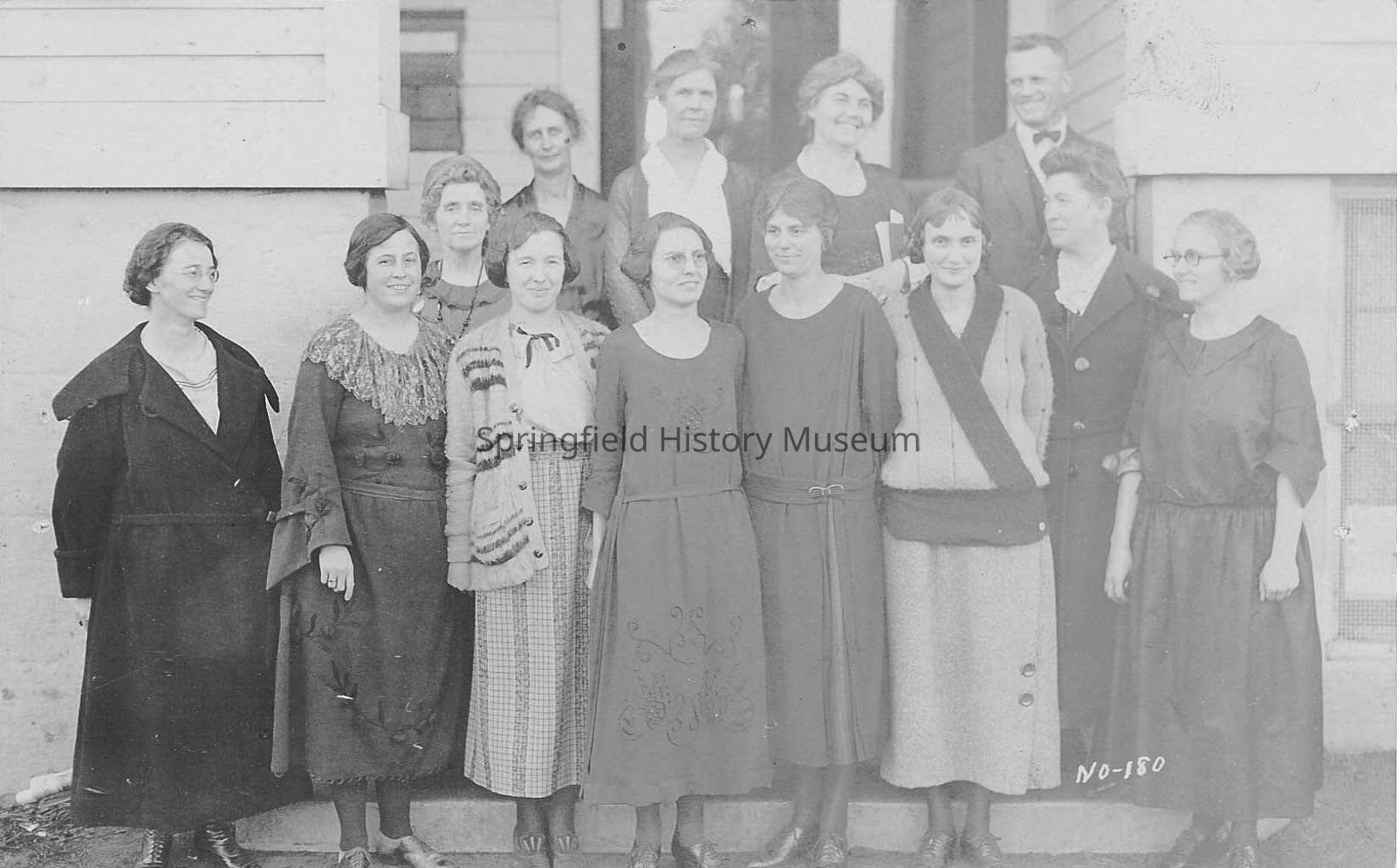 Photograph of teachers at Springfield, 1922. A group of thirteen people including Elizabeth Page and Opal Roberts. Photo marked No-180. Postcard.Photograph Details