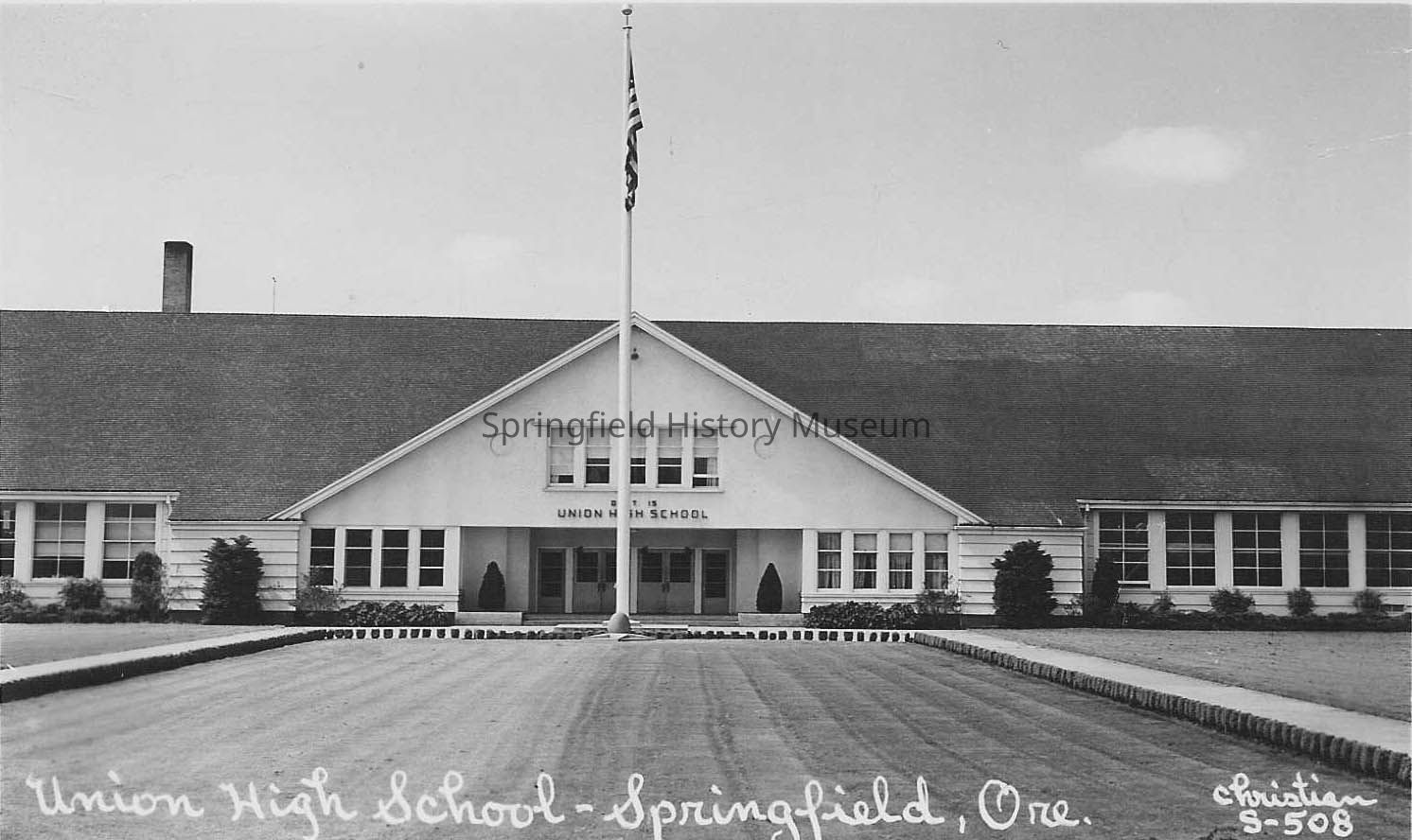 Union High School, Springfield, Oregon taken early 1950s. Shows the school across a wide lawn with a flag pole in center. Postcard