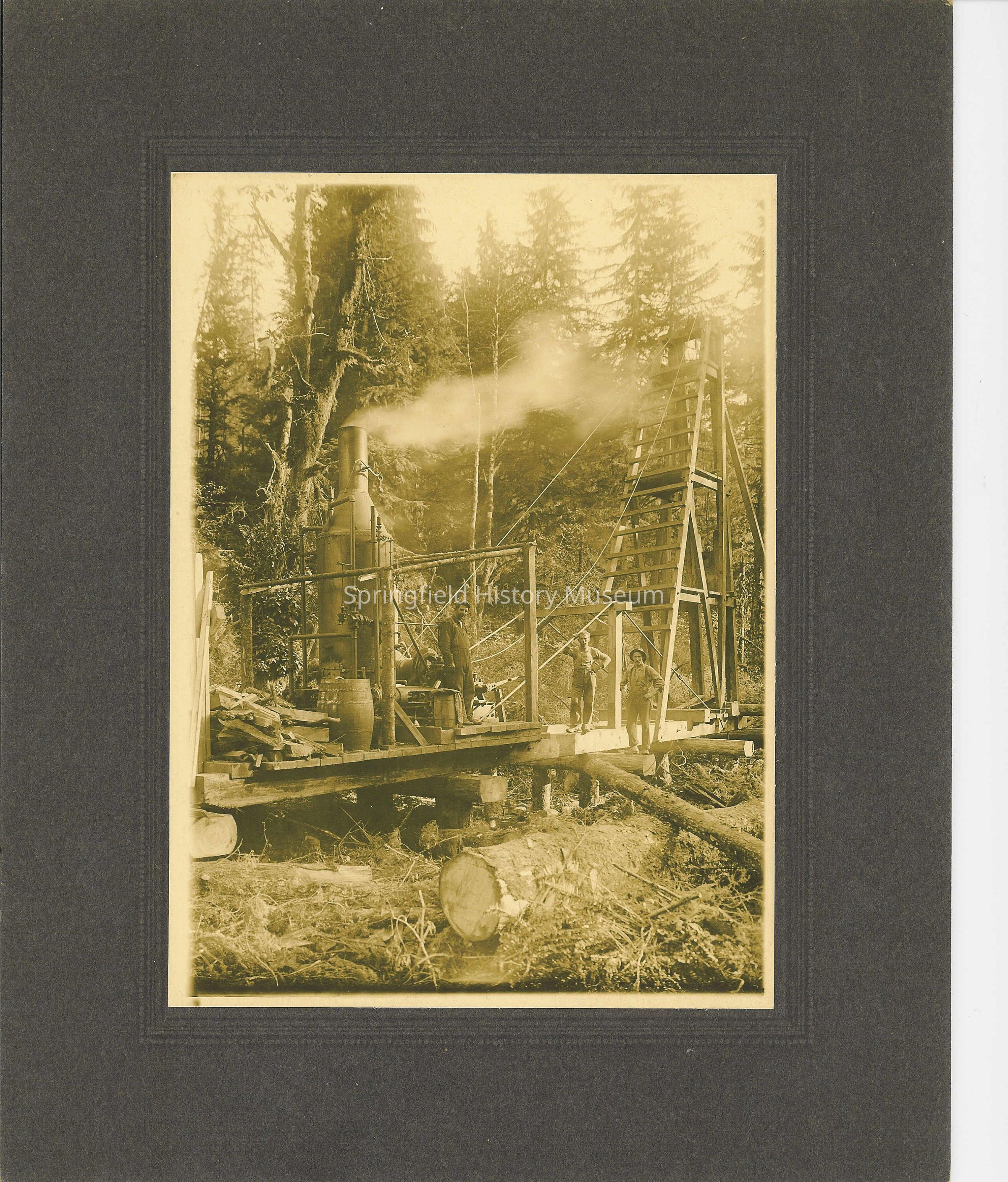 Photograph of Steam Donkey and Cable Tower with three unidentified men, date unknownEntry/Object ID