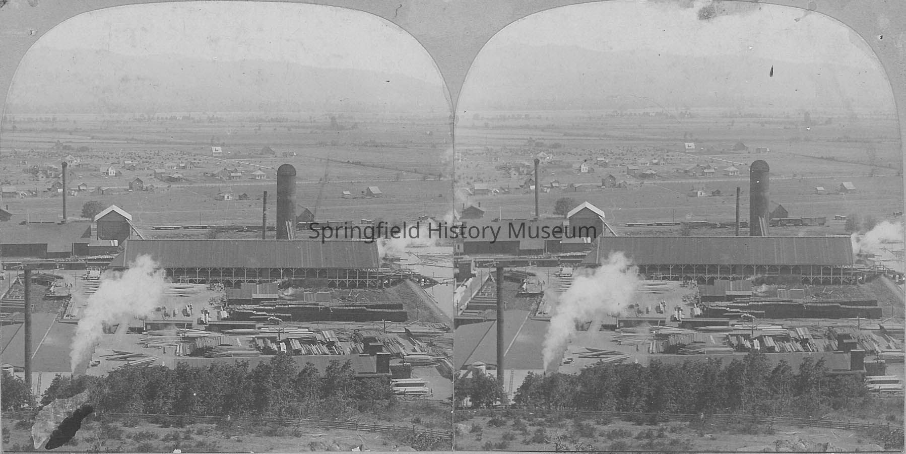 Photograph of Booth-Kelly mill in stereoscope. From Western Stereoscopic Company, E A Stonecypher, Mgr., Gothenburg, Nebraska. Marked on front No. 51, Springfield, Ore. In ink Maude Bryan 14. Steam plant has single stack.Collection