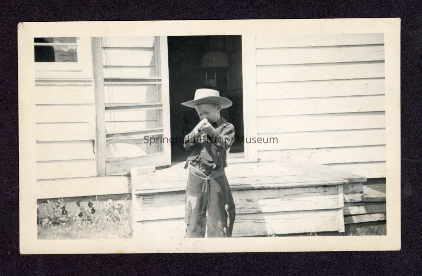 Black and white photograph of Steve Moe as a child dressed as a cowboy in front of family house.Collection