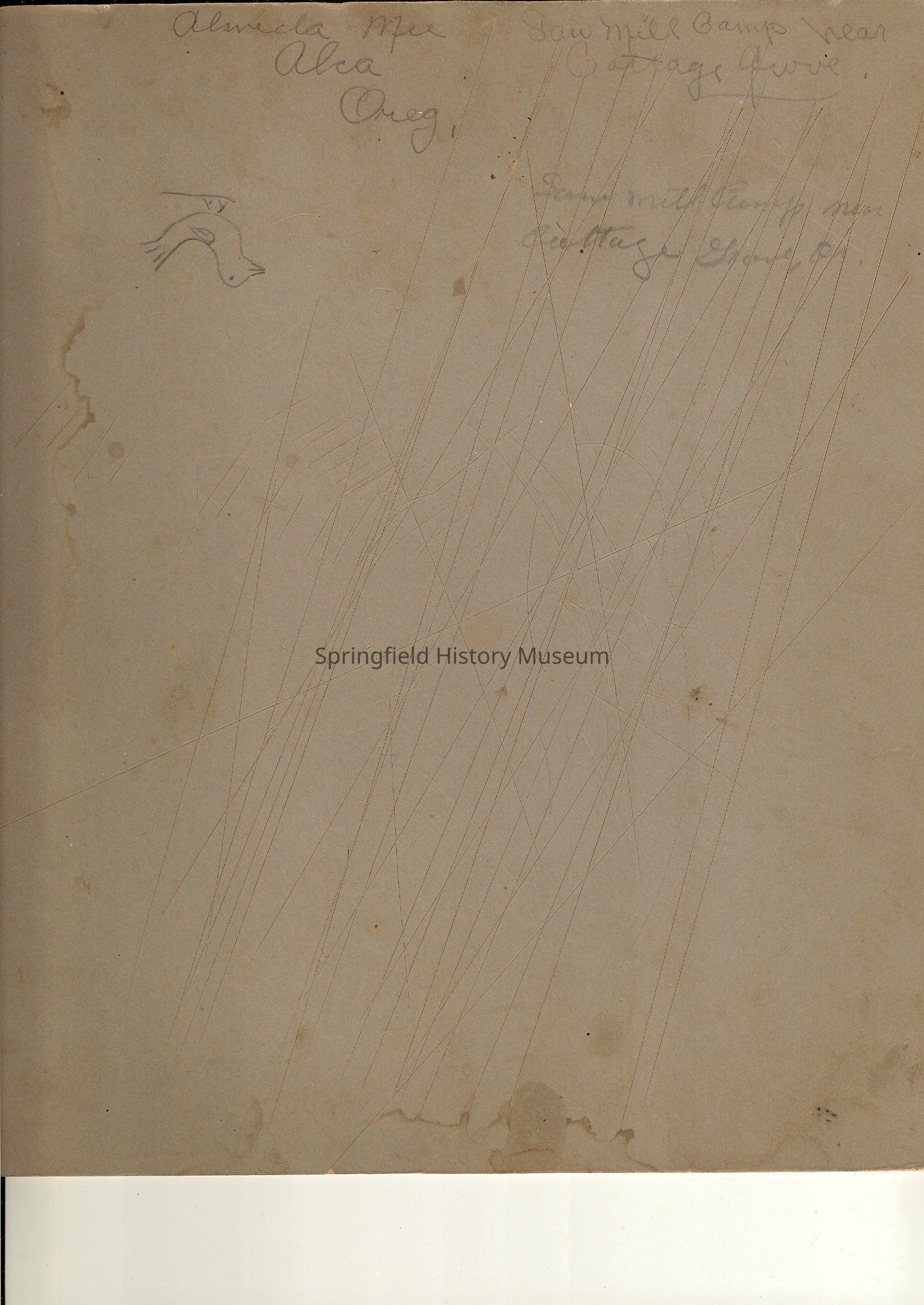 In pencil on the back, there is a drawing of a bird and the words, "Almecla Mill, Alca, Oreg, saw mill camp near Cottage Grove."Collection