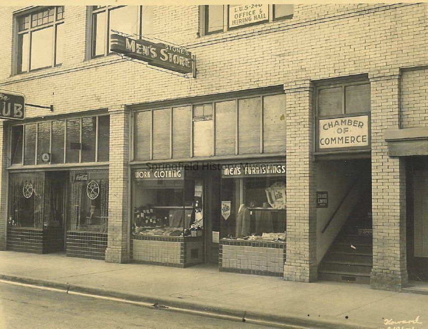 Business & Industry, Street Views, Stone's Men's Store, Commercial State Bank, Chamber of Commerce, Main Street, 4th Street, L.U.S. Office & Hiring Hall, Work Clothing, Men's Furnishings, Street Views, Coca Cola, Business & Industry--Stone's Men's Store, Business & Industry--Banks--Commercial State Bank, Buildings--Chamber of Commerce, Springfield--Streets--Main Street, Springfield--Streets--4th Street, Street Views--Springfield
