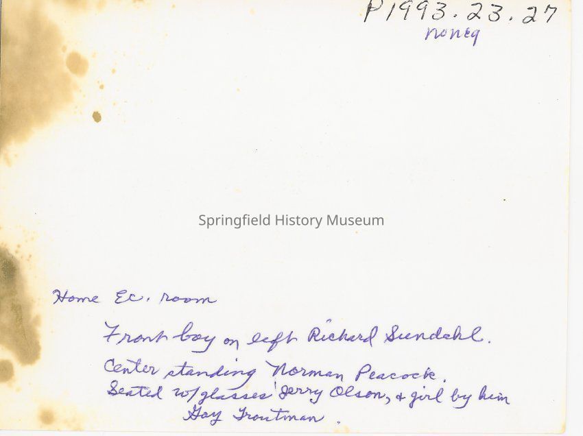 Transcribed inscription on reverse: "Home Ec room, front boy on left Richard Siendahl, center standing Norman Peacock, seated w/ glasses Jerry Olsen, and girl right next by him Gay Troutman" Rest are unidentified.Photograph Details