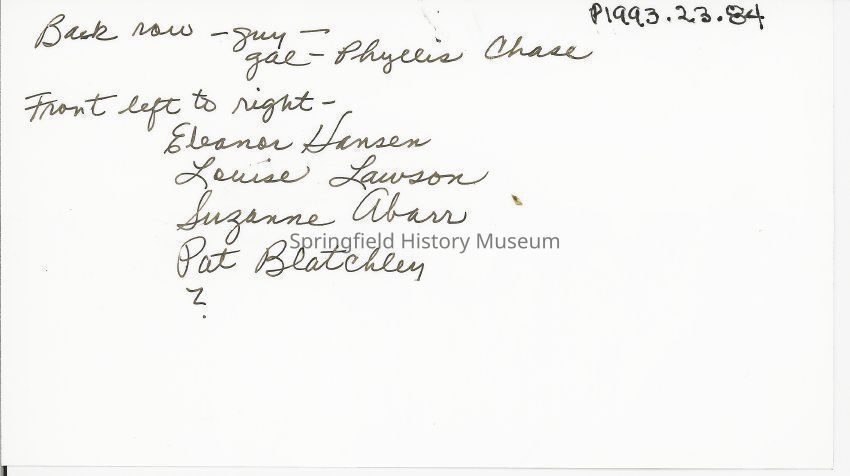 Transcribed inscription on reverse: "Back row - guy - gal - Phyllis Chase, front left to right Eleanor Hanser, Lauise Lawson, Suzanne Abarr, Pat Blatchley, ?"Photograph Details
