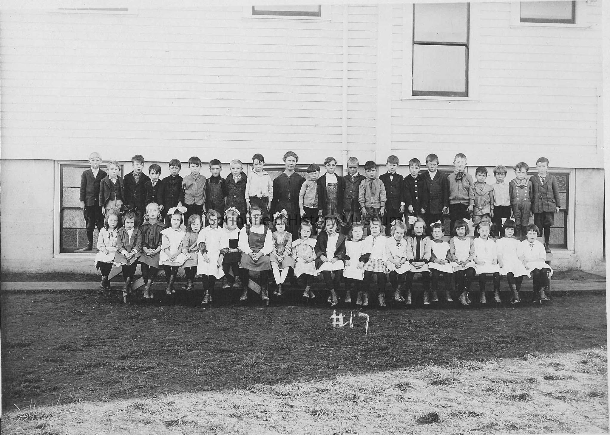 Photograph of students outside Lincoln School. Two rows of students with teacher, Elizabeth Page, standing in middle of back row. Forty-one students in all. Photo marked #17, mounted on board.Photograph Details